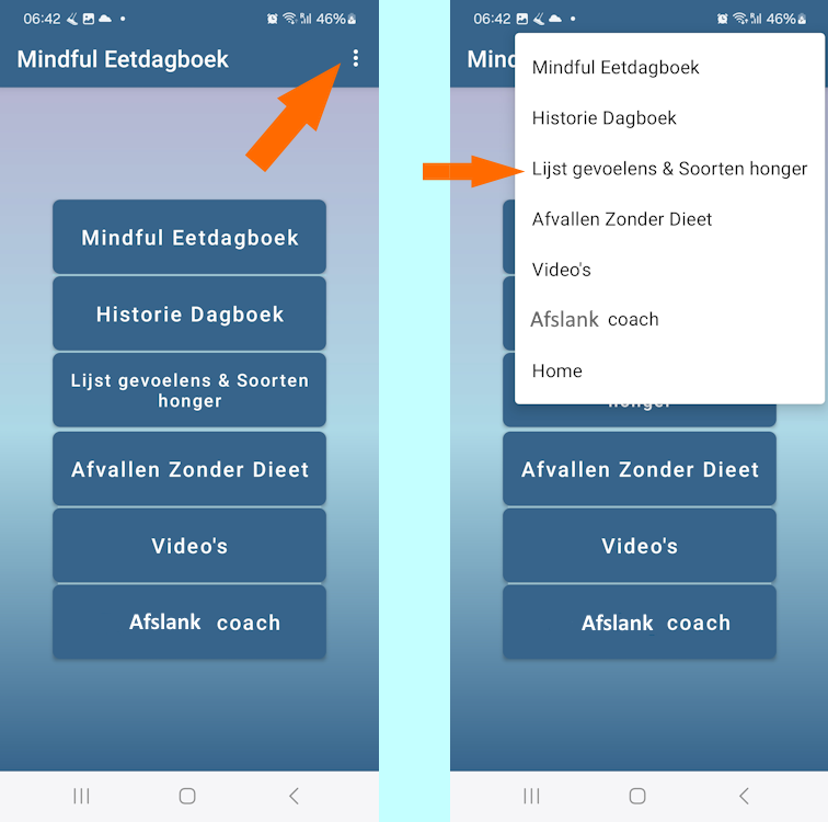 Nb. als je een eetmoment aan het invullen bent in het eetdagboek, gebruik dan de 3 puntjes rechtsboven in de app om naar de pdf met de lijst van gevoelens en soorten honger te gaan.
