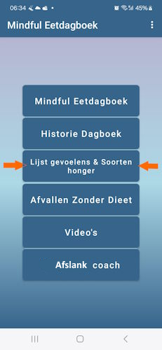 In de app Mindful Eetdagboek vind je als derde link ‘Gevoelens en Soorten Honger’